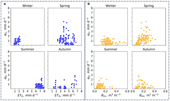 Variation classified by season in the reference evaporation rate for the 6 plots with (a) the computed potential evaporation rate from the agrometeorological station (ETo), and with (b) the initial substrate moisture at the onset of the evaporation processes ().
