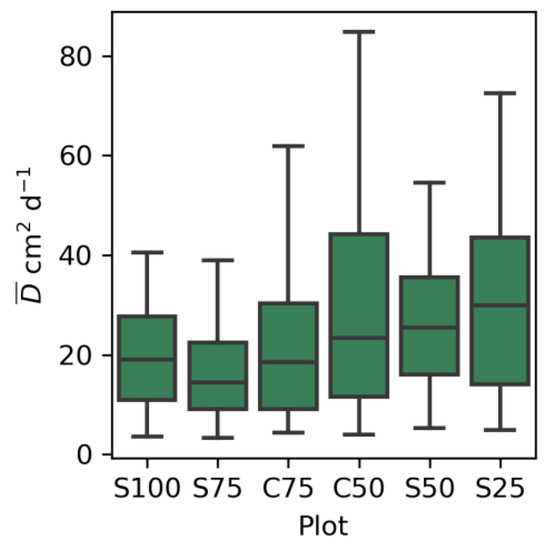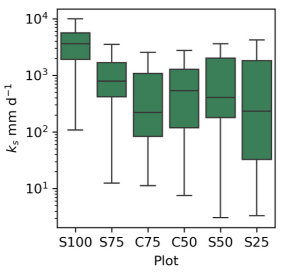 The maximum mean value of hydraulic conductivity corresponds to substrate S100, followed by substrates S75 and S50. In plots S100, S75, S50, and S25, with the same vegetative substrate and increasing percentage of recycled aggregates, a general trend in decreasing saturated hydraulic conductivity, ks, with an increase in the percentage of aggregates is observed. The opposite pattern is observed in plots C75 and C50, where aggregates are mixed with compost (Table 1), with a 313 cmd−1 difference in the median value.