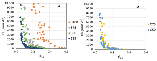 Variations in Ks with the initial moisture of each drydown period (a) for the mixtures with vegetative substrate type S, and (b) for the mixtures with vegetative substrate type C.