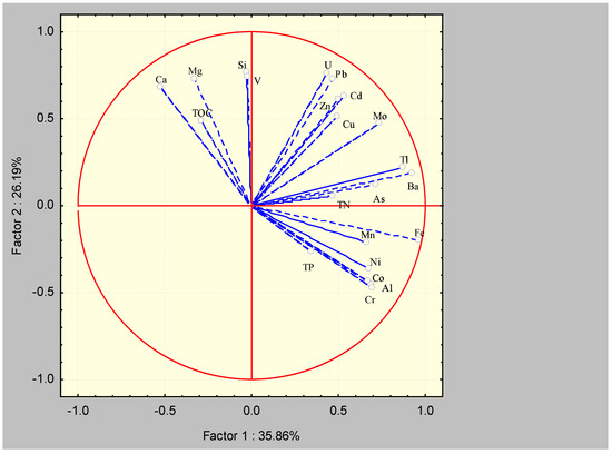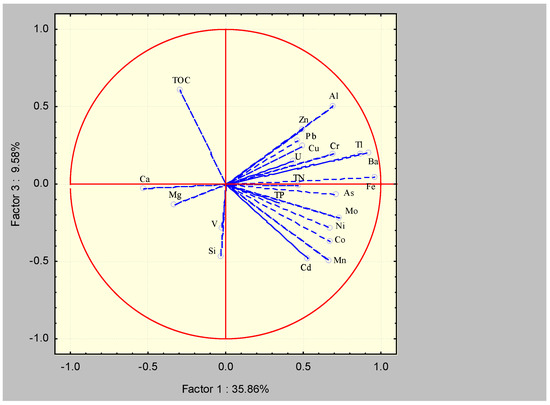 Figure 5 shows the dependence diagram of components PC1 and PC2, while Figure 6 shows components PC1 and PC3 for sediments from researched karstic springs. The first three components explained 71.6% of the total variability of 22 variables. The first component described 35.8% of the data variance, the second 26.1%, and the third described 9.58% of the variance. High positive values of PC1 were characteristic of Fe, Ba, Cr, Al, Tl, Mo, Cd, As, Mn, Ni, and Co. Furthermore, the first component described TN, but not with high values. It can be concluded that the first component represented a combined lithogenic influence described primarily by the content of Fe and Al, an oxidative–reductive influence described by the content of Mo and Cd, as well as a biogenic influence described by the content of TN, considering that it comes from the surrounding vegetation. High positive PC2 values were characteristic of Ca, Mg, Si, V, U, Pb, and Zn. Additionally, the second component described TOC, but not with high values. It can be concluded that the second component reflected the combined influence of the geological background of the surrounding area, including TOC content, and an oxidative–reductive influence described by the content of U. TOC had high positive values and the greatest influence on PC3, while Si and V had negative but not high values.