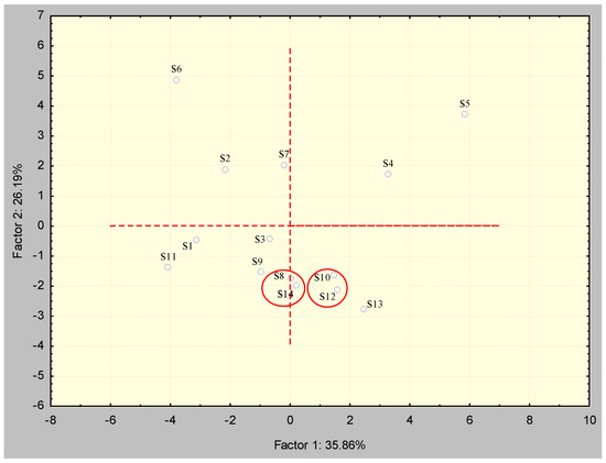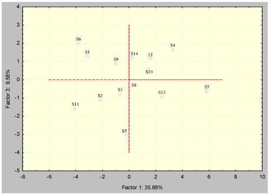 The distribution based on factor scores concerning components PC1 and PC2 according to Figure 7 showed two different groups of locations that were grouped according to their elemental composition, while the other springs remained relatively dispersed. The first group consisted of springs S8 and S14, which were grouped according to Ca content, while the second group consisted of springs S10, S12, and S13, which were grouped according to Mn and Si content. Spring S6 stood out from the others for its Ca, Mg, and especially TOC content, which were the highest of all sources. On the other hand, springs S4 and S5 stood out due to oxidative–reductive influence, which was the most pronounced in these springs considering the content of Mo and U, while S5 also stood out for its Fe content. Springs S1, S3, S9, and S11 did not form a group and stood out from the others concerning the first component, according to the content of Ba and Cr. The distribution based on the factor scores concerning components PC1 and PC3 (Figure 8) did not show the separation of springs into groups, but the springs remained quite dispersed. The separation of spring S7 according to the content of Si could certainly be seen.