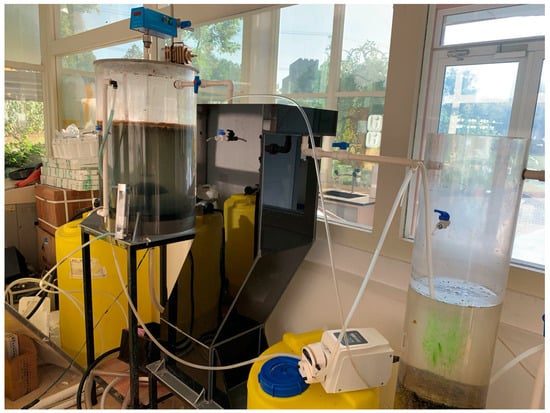 The C/N ratio of wastewater was adjusted by adding different amounts of CH3COONa to the wastewater, namely 2.0, 3.0, 3.5 and 4.0, and the COD and NO3−-N of the effluent water were measured to determine the optimal C/N ratio. Figure 1 shows part of the setup during the experiment, and Figure 2 is a schematic diagram for each part of the experimental unit.