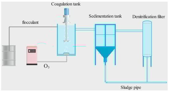 In addition to controlling the dosage of flocculant, incorporating pre-oxidation facilities before flocculation and microbial nitrogen removal facilities after flocculation are two effective approaches. Pre-oxidation of wastewater with oxidizing agents such as ozone, KMnO4, HClO, etc., can significantly reduce the content of COD and other pollutants in wastewater [25]. Among them, ozone is a potential pre-oxidizer due to its high oxidizing capacity and its own easy degradation [24]. The C/N ratio affects the efficiency of denitrification, as previous wastewater treatments generally have the disadvantage of insufficient carbon source and a low C/N ratio, which directly leads to a low rate of denitrification. It is necessary to use an additional carbon source, like CH3COONa, as an electron donor for denitrification [26,27]. This study proposed to add ozone pre-oxidation before flocculation and denitrification after flocculation to enhance the wastewater treatment effect, while exploring the optimal dosage of flocculant and the optimal concentration of ozone.