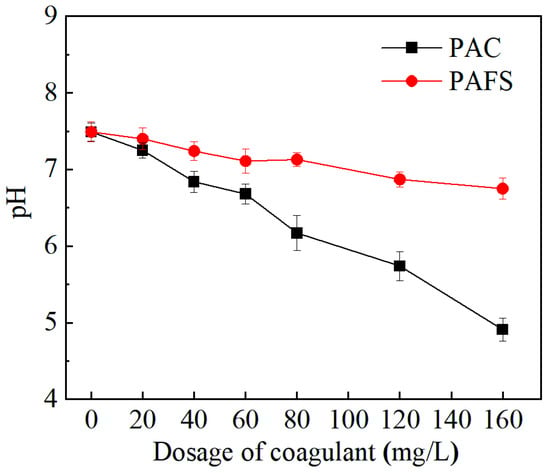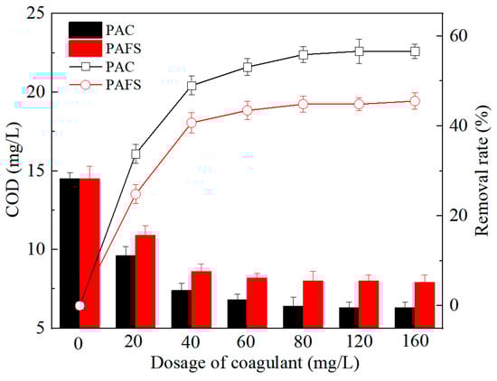 As can be seen from Figure 3, the pH of the wastewater showed a decreasing trend with the increasing dosage of the two flocculants. However, the pH of PAC decreased more rapidly from the original value of 7.5 to 4.91, leading the water body to be acidic, while that of PAFS finally reduced to 6.75, and the water was still neutral. The reason for this difference was that PAC released a large amount of Al3+ and underwent hydrolysis after being added to the water [28], producing a large amount of colloidal precipitation Al(OH)3 and obtaining a large amount of H+, which led to a rapid and continuous decrease in pH. PAFS contained Fe, and the presence of Fe altered the polymer’s morphology and increased the polymer’s complexation ratio [22]. Although PAC could reduce the pH value of wastewater, the pH drop is not significant and will not have a big impact on water treatment. The removal rate of COD in wastewater increased with the increasing dosage of both flocculants (Figure 4), reaching a plateau at a dosage of 80 mg L−1. With the increase in PAC dosage, the COD concentration decreased from 14.5 mg L−1 to 6.3 mg L−1, while the PAFS treatment decreased from 14.5 mg L−1 to 7.9 mg L−1. Accordingly, the removal of COD with PAC was higher than that with PAFS, and the optimal dosage was 80 mg L−1. The outstanding flocculation behavior of PAC was attributed to the fact that it mainly used the compression bi-layer effect and adsorption electro-neutralization of the high valence polynuclear complexes produced during hydrolytic condensation [28]. When PAC was added to wastewater, a large number of positive charges would be generated to neutralize the negative charges carried on the surface of colloidal particles, reducing the electrostatic repulsion between the colloids, thus promoting the flocculation of colloids into particles and the formation of larger flocs through the adsorption, sweeping, etc., and then precipitation [29]. However, excessive dosing of PAC may lead to the re-stabilization of colloidal particles by changing their surface charge, reducing the flocculation effect [28,29]. In the case of PACS, higher removal rates were due to the sweep flocculation mechanism [30].