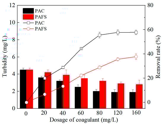 The turbidity of the wastewater was reduced with the increasing dosage of flocculant (Figure 5). The turbidity under PAC and PAFS treatments decreased from 4.5 mg L−1 to 1.9 mg L−1, and from 4.5 mg L−1 to 2.8 mg L−1, respectively. It could be seen that the removal efficiency of PAC was higher than that of PAFS. The removal mechanism for PAC and PAFS was a combination of swept flocculation and charge neutralization. The removal was most likely due to charge neutralization after correlation analysis [20]. When the dosage was 80 mg L−1, the reduction in turbidity reached the plateau, so 80 mg L−1 was the optimal dosage.