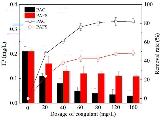 Similar situations were also observed for TN and TP. The removal rates of TP increased with the increasing dosage of both flocculants (Figure 6). PAC was better than PAFS from the beginning to the end, and the final removal rate was maintained at 32%. In the early stage, the removal rate of TP by two flocculants increased rapidly, but after 60 mg L−1, it increased slowly until reaching the plateau. Figure 7 shows the removal rates of TN with the dosage increase. It can be seen that the TN treated with PAC decreased from the initial 10.2 mg L−1 to 8.8 mg L−1, while the TN treated with PAFS decreased from 10.2 mg L−1 to 8.95 mg L−1. The TN decreased with the increase in flocculant dosage. Its removal rate increased rapidly in the early stage, then decreased slowly in the later stage and remained stable after 80 mg L−1. The removal rate under PAC treatment was always higher than that under PAFS treatment, eventually stabilized at about 2.0%. Due to the fact that phosphorus-containing ionic had a negative charge, it could easily charge neutrality with the PAC which had a positive charge, so as to make colloid off and precipitate [31].