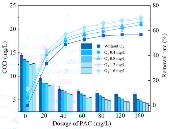 Changes in COD concentration in effluent and its removal rate with increasing dosage of PAC under different O3 pre-oxidation conditions.