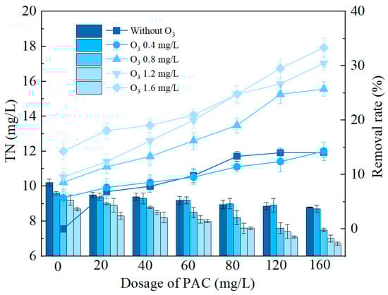 The removal rates of COD after ozone pre-oxidation are shown in Figure 8. The COD concentration decreased with the increase in PAC dosage. When the ozone amount was 0.4 mg L−1, as the dosage of PAC increased from 0 to 160 mg L−1, the COD concentration decreased from 13.6 mg L−1 to 5.1 mg L−1 and the removal rate increased from 6.21% to 64.8%. At the ozone dosage of 0.8 mg L−1, the COD content decreased from 13.2 mg L−1 to 4.8 mg L−1, and its removal rate increased from 8.96% to 66.9%. For enhanced organic removal performance in the flocculation, pre-oxidation produced some hydrophobic neutral and the intermediate molecular weight dissolved organic matter at suitable ozone dosages [32]. Pre-oxidation could improve the concentration of O-containing functional groups, such as -OH and -COOH groups, which could interact and complex with flocculants to promote flocculation [33]. At the ozone dosage of 1.2 mg L−1, the COD content decreased from 12.5 mg L−1 to 4.5 mg L−1 and the removal rate increased from 13.9% to 68.9%. At the ozone dosage of 1.6 mg L−1, the COD content decreased from 12.7 mg L−1 to 4.3 mg L−1, and the removal rate increased from 12.4% to 70.3%. Organic matter usually contains C-C and C-H bonds, while ozone molecules contain O atoms in the higher energy states. When ozone comes into contact with organic matter and reacts, the ozone breaks down into free O atoms. Free O atoms have a high oxidizing capacity and are able to react with the C-C and C-H bonds in organic matter to form C-O and C-O-O bonds. These oxidation reactions result in the decomposition of organic matter. The COD removal rate increased sharply to more than 40% when PAC was set as 20 mg L−1, but when PAC was set as 80 mg L−1, the COD removal rate after 1.2 mg L−1 of ozone pre-oxidation had already reached a relatively high level. Ozone pre-oxidation increased the removal rate of COD by PAC. The TN content decreased gradually with the increase in PAC dosage (Figure 9). At an ozone concentration of 0.4 mg L−1, with the increase in PAC dosage, the TN content decreased from 9.6 mg L−1 to 8.7 mg L−1 and the removal rate increased from 5.71% to 14.3%. When the ozone concentration was of 0.8 mg L−1, the TN content decreased from 9.3 mg L−1 to 7.5 mg L−1 and the removal rate increased from 8.57% to 25.7%. At an ozone concentration of 1.2 mg L−1, the TN content decreased from 9.2 mg L−1 to 7 mg L−1 and the removal rate increased from 9.52% to 30.5%. As for 1.6 mg L−1 ozone, the TN content decreased from 8.7 mg L−1 to 6.7 mg L−1, and the removal rate increased from 14.3% to 33.3%. It could be seen that the 0.4 mg L−1 ozone concentration had little effect on TN removal, 1.2 mg L−1 could achieve a better TN removal rate and 1.6 mg L−1 of ozone was comparable to 1.2 mg L−1. Ozone pre-oxidation significantly improved the effect of PAC on TN removal. Zhao et al. [34] showed that, after ozone pre-oxidation, the reactor’s nitrogen removal performance experienced a significant decline, and it remained stable after one week with a nitrogen loading rate (NLR) of 0.60 ± 0.05 kg N/(m3·d). Zhang et al. [35] showed that, at an ozone concentration of 40 mg L−1, the concentrations of TN and NH4+-N in sludge supernatant were of 144.3 mg L−1 and 38.8 mg L−1, respectively.