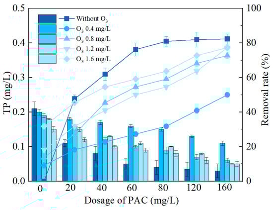 The content of TP decreased with the increase in PAC dosage (Figure 10). At an ozone concentration of 0.4 mg L−1, the TP content decreased from 0.2 mg L−1 to 0.11 mg L−1 as the PAC dosage increased, and the removal rate increased from 9.01% to 50%. As for 0.8 mg L−1, the TP content decreased from 0.19 mg L−1 to 0.06 mg L−1 and the removal rate increased from 13.6% to 72.7%. As for 1.2 mg L−1, the TP content decreased from 0.18 mg L−1 to 0.05 mg L−1 and the removal rate increased from 18.2% to 77.3%. As for 1.6 mg L−1, the TP content decreased from 0.15 mg L−1 to 0.05 mg L−1 and the removal rate increased from 31.8% to 77.3%. The removal of TP by PAC decreased by 32.3% when the ozone concentration was of 0.4 mg L−1. As the ozone concentration increased, the effect of PAC on TP removal increased. This was because TP was present in the secondary effluent as orthophosphate or polyphosphate in phosphate-accumulating organisms [24]. When aluminum salts were dispersed into the wastewater, PO43− reacted with Al3+ to form a precipitate which was removed from the water [36]. In the secondary effluent, residual organic compounds adsorbed to the surface of small phosphorus-containing particles, forming a coating that hindered the flocculation reaction [37]. While the polyphosphorus in cells could not react with Al3+, O3 could react with the organic compounds to lift the coating, exposing the phosphorus and improving the flocculation process [38]. In addition, O3 was a good disinfectant, which could destroy and dissolve the cell wall and release the cytoplasm [36], while the polyphosphorus in the cells was released and reacted with Al3+ [24].