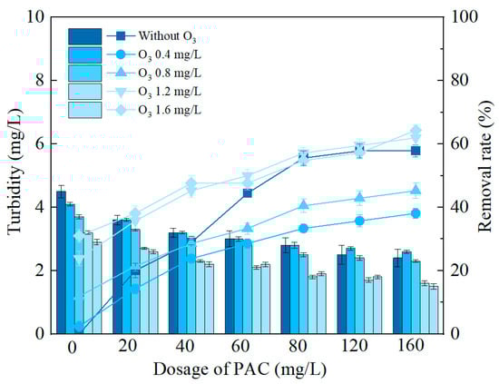 Changes in turbidity in effluent and its removal rate with increasing dosage of PAC under different O3 pre-oxidation conditions.