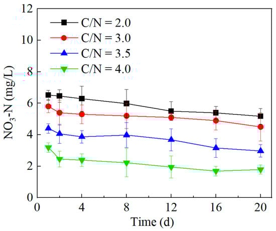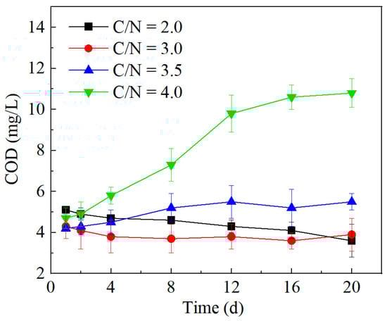 Figure 12 shows the concentration of effluent COD with time under different C/N conditions. When the C/N ratio was 4.0, the concentration of effluent COD was raised from 4.5 mg L−1 to 11.0 mg L−1. Meanwhile, in the other C/N conditions, the effluent COD concentration finally remained at a concentration similar to the initial concentration. Kargi et al. [40] showed that the removal efficiencies of COD, NH4+-N and NO3−-N were maximum at the levels of 96%, 87% and 81%, respectively. Zhu et al. [41] concluded that an increase in the C/N ratio led to an increase in the removal of TN, NO3−-N and COD, which reached a maximum when the C/N ratio was 5. The trend of NO3−-N over time under different C/N conditions is shown in Figure 13. Initial values for each group of treatments were different because the water samples were detected after one day of treatment, which suggested that the C/N ratio worked on the first day. At C/N = 2.0, the NO3−-N concentration decreased from 6.52 mg L−1 to 5.17 mg L−1. As for C/N = 3.0, the NO3−-N concentration decreased from 5.8 mg L−1 to 4.5 mg L−1. As for C/N = 3.5, the NO3−-N concentration decreased from 4.4 mg L−1 to 2.97 mg L−1. As for C/N = 4.0, the NO3−-N concentration decreased from 4.4 mg L−1 to 2.97 mg L−1. As for C/N = 4.0, the NO3−-N concentration decreased rapidly from 3.19 mg L−1 to 1.79 mg L−1. It can be seen that, with the increase in the C/N ratio, the NO3−-N removal effect became better. The most significant decrease in NO3−-N concentration was observed at a C/N ratio of 4.0. Gu et al. [42] showed that a high C/N ratio increased the nitrogen removal efficiency of the heterotrophic nitrification–aerobic denitrification process. Yang et al. [40] used pig manure hydrolysate as a carbon source, and the results showed that, when the C/N ratio was 5.5, there was a high NO3−-N concentration in the effluent, and the lack of nitrite reductase inhibited the heterotrophic denitrification process, resulting in incomplete denitrification. The C/N ratio suitable for denitrification was 6.5, which corresponded to 3.8% of the added amount. Under this condition, TN removal was up to 90%, and the performance of swine manure hydrolysate was better than that of sodium acetate. Schroeder et al. [43] reported that, when the C/N ratio was increased from 1:1 to 3:1, the TN removal rate increased from 49.0% to 72.0%, when glycerol was used as an external carbon source. The above results suggest that increasing carbon inputs could improve denitrification efficiency.