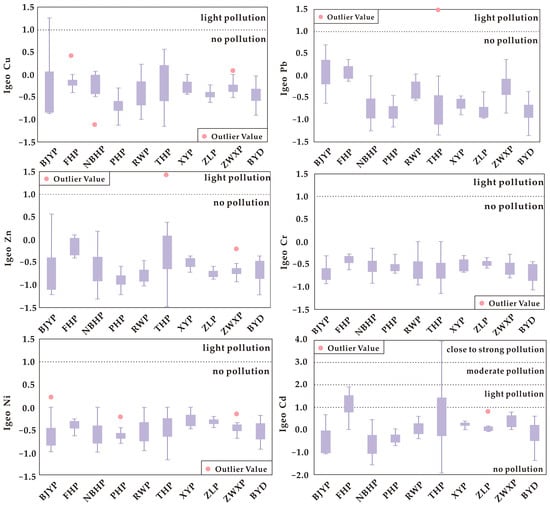 where Ci is the measured concentration of heavy metal i (mg/kg), and Bi represents the local background value of heavy metal i (mg/kg) (Table 1). The pollution levels are classified as practically no pollution (Igeo ≤ 0), light pollution (0 < Igeo ≤ 1), close to moderate pollution (1 < Igeo ≤ 2), moderate pollution (2 < Igeo ≤ 3), close to strong pollution (3 < Igeo ≤ 4), strong pollution (4 < Igeo ≤5), and extreme pollution (Igeo > 5) [27,70].