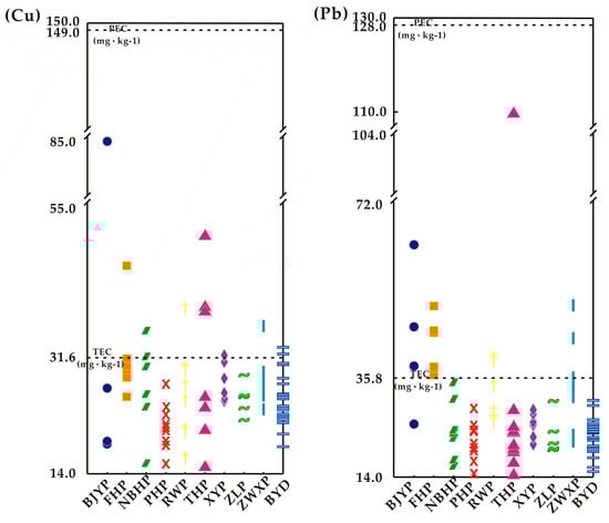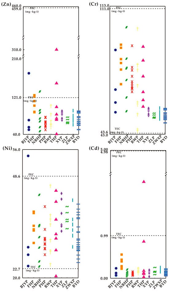 When ΣTUs < 4, heavy metals in sediments can be deemed as non-toxic; when ΣTUs ≥ 6, it can be classified as having acute toxicity; and when 4 ≤ ΣTUs < 6, it can be categorized as having moderate toxicity [81,82,83]. Moreover, if the Ci is below the threshold effect concentration (TEC) (mg/kg) (Table 3), the toxic effect rarely occurs; if the Ci exceeds the PEC (mg/kg), the toxic effect will occur frequently; and if the Ci is within the range of TEC and PEC, the toxic effect will occasionally occur [84,85,86]. The classification of ISQGs is displayed in Table 4 [16,87,88].