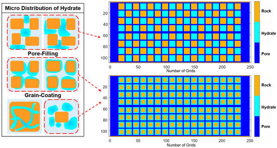It has been shown in many works that natural gas hydrate reservoirs currently exist in different modes at the microscale []. In order to better characterize the hydrate dissociation mechanism, we designed the pore-filling type and the grain-coating type, based on two common hydrate reservoir modes. Two different microstructures are shown in Figure 1. The model size length × width = 250 × 110, where the size of the hydrate and rock particles is 11 × 11. The unit of the model size is the number of grids. The square particles of rock and hydrate make the fluid flowing in the pores more similar to the flowing in slender pipes. This design ensures that the models have a porosity closer to the real reservoir (less than 15%) while allowing the thermal fluid to flow smoothly [].