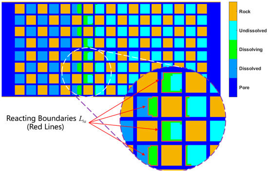 The undissolved grids shown in Figure 2 are the equations shown in the first row of Equation (9); that is, the current grid’s temperature has not reached the equilibrium condition. The dissolving grids shown in Figure 2 are those in the second and third rows of Equation (9); that is, the current grids satisfied the equilibrium condition, but the accumulated energy does not satisfy the phase transition condition. These grids maintain solid properties, and their contact boundaries with the flow grids in the pores are the activation contact areas , as shown by the red lines in Figure 2. The contact areas in this model that can be calculated as . are the reacting boundaries, and is the height of this model. The dissolved grids shown in Figure 2 are those in the fourth row of Equation (9); that is, the current accumulated energy of these grids was over the limit of the heat absorption enthalpy. Then, those grids will alter from a solid into a fluid and be part of the collision calculation of fluids. Then, the fluid–solid boundary evolutions with the hydrate activation reaction are realized.