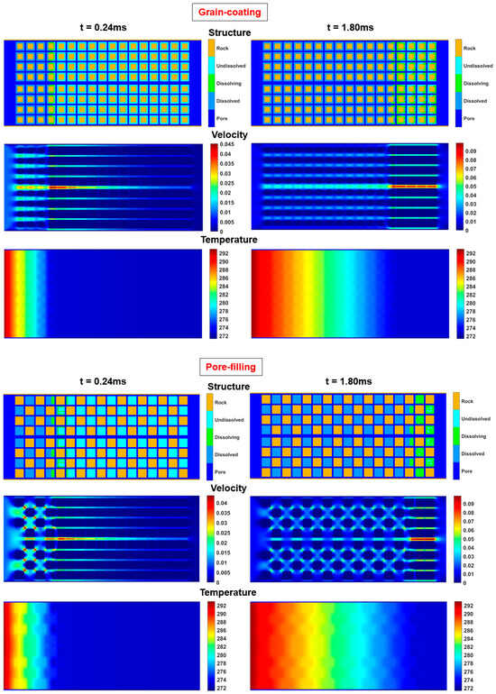 Set the left side as the hot fluid inlet and the right side as the hot fluid outlet. Other parameters and boundaries can be set as in Table 1, including the initial conditions and different lattices [,]. Set the hydrate totally dissolved as the ending point. Simulate the pressure, velocity, and temperature at different times in the porous model. Fully consider the impact of fluid–solid boundary behaviors after hydrate dissociation. The calculation results of the structural field, velocity field, and temperature field at some time nodes are shown in Figure 3.