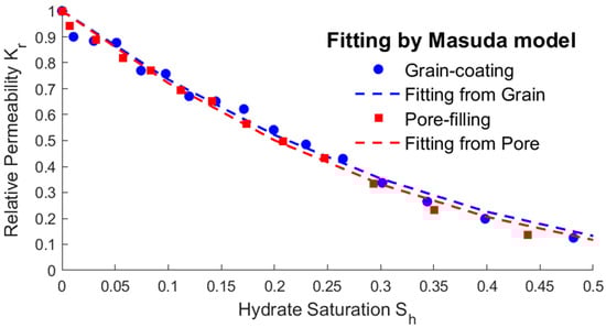 Fitting results between hydrate saturation and relative permeability by the Masuda model and KC model.