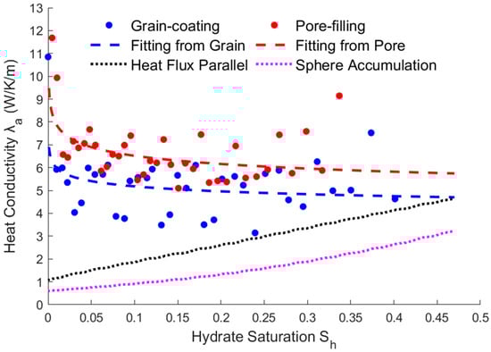 The simulation results are shown in Figure 5. The simulation results are significantly dispersed. Even if the time interval is increased, it is difficult to improve the fitting accuracy. Although the effective thermal conductivity fluctuates as the saturation decreases, the overall result gradually increases as the saturation decreases. The effective thermal conductivity of the grain-coating hydrate is smaller than that of the interval hydrate. Fitting the above calculation results, it is found that they can be approximately fitted by a power exponential equation, and the results are shown as follows.
