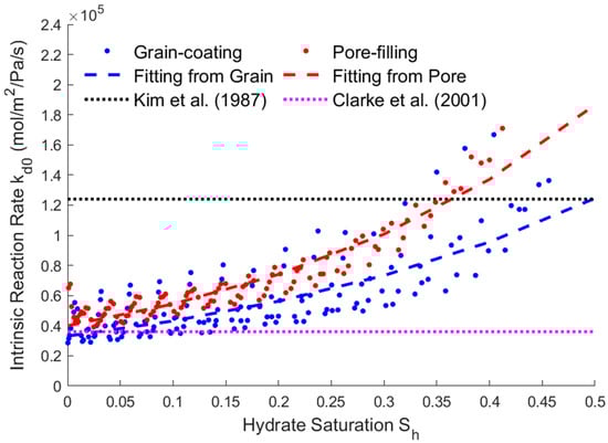It can be seen from Figure 7 that the intrinsic reaction rate gradually decreases with the decrease in saturation. Comparing the simulation results of two different structures, the intrinsic reaction rate of the grain-coating type hydrate is smaller than that of the pore-filling type. By fitting the results, the expressions of the intrinsic reaction rate can be obtained.