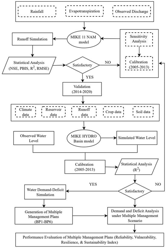 The present study employed the MIKE HYDRO Basin model to analyse the water demand and deficit within the Parvati command area from 2005 to 2020. This model operates on a network of branches and nodes, which can be directly digitized using map view facilities or extracted from a digital elevation model. The river network and water transfer within the basin were delineated using the connected river segment, computational nodes, and module-specific features. Each river node was associated with catchments that contributed inflow data to the node. Moreover, the model integrated reservoirs as pivotal components, simulating single and multiple multipurpose reservoirs. These reservoirs could be configured with defined operational protocols, rights for resource allocation, or no-operation policy. In the MIKE HYDRO Basin framework, a water user is categorized as an ordinary user with a designated demand series or an irrigation water user. The model accounted for various factors affecting irrigation, including climate, soil, crop sequences, and irrigation techniques used by water users. The climate sub-model integrated rainfall and temperature data. The reference evapotranspiration (ET0) sub-model calculated evapotranspiration losses using climate data. The soil water sub-model incorporated soil types and properties such as the field capacity and wilting point. The crop sub-model included crop types, sowing dates, growth stages, and crop coefficients. Once all sub-models were configured, the model executed simulations and generated output files containing data such as total irrigation demand, individual user demands, net flow, deficits, reservoir storage levels, channel flows, etc., at predefined time intervals. The flowchart of the detailed methodology of the study is shown in Figure 2.