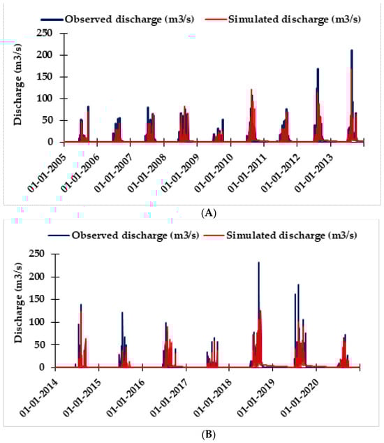 (A) Comparison between observed and simulated discharge during calibration of the MIKE 11 NAM model. (B) Comparison between observed and simulated discharge during validation of the MIKE 11 NAM model.