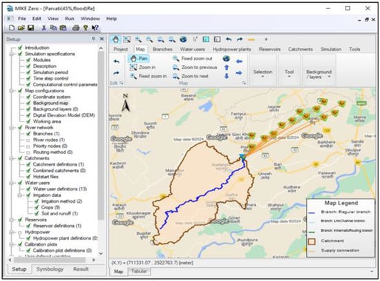 A network model using the MIKE HYDRO Basin was created for the Parvati Reservoir project to enhance water resources management and facilitate irrigation planning. This project involved 13 irrigation water users, namely Mudhik, Banora, Dopura, Salempur, Patipura, Makra, Nagla, Saipau, Piphera, Basai Nawab, Kolari, Knasil, and Nirdhara Kala. The MIKE HYDRO Basin model for the Parvati reservoir system is depicted in Figure 4.