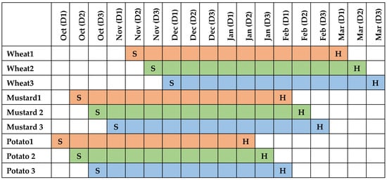 Existing cropping pattern in Parvati command. D1: first 10-day period of a month (from the 1st to 10th day); D2: second 10-day period of a month (from the 11th to 20th day); D3: third 10-day period of a month (from the 21st to 28th/29th/30th/31st day); S: Planting period; H: harvesting period.