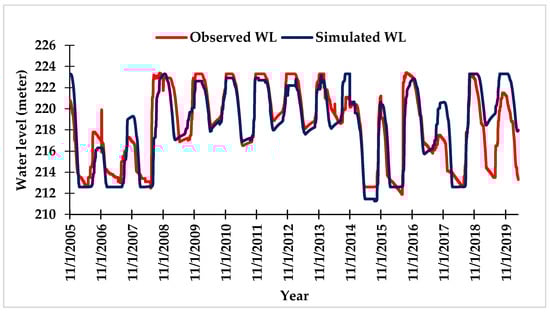 The calibration process of the MIKE HYDRO Basin model mainly depends on accurately calibrating the MIKE 11 NAM model. Runoff data obtained from the calibrated MIKE 11 NAM model serve as input for calibrating the MIKE HYDRO Basin model [47]. The calibration was carried out from 2005 to 2020. A comparison between the daily observed and simulated water level (WL) of the reservoir is depicted in Figure 6. Results showed a strong agreement between the observed and simulated water levels of the reservoir on a daily basis, with R2, NSE, RMSE, PBIAS, RSR, and KGE values of 0.86, 0.81, 3.87, −2.30%, 0.43, and 0.88, respectively. This high correlation indicates the model effectively replicates the behaviour of the reservoir system, providing reliable forecasts of water levels. Consequently, the model is a reliable tool for simulating reservoir operations and guiding water management decisions within the Parvati command area.