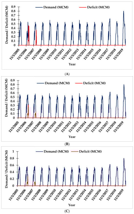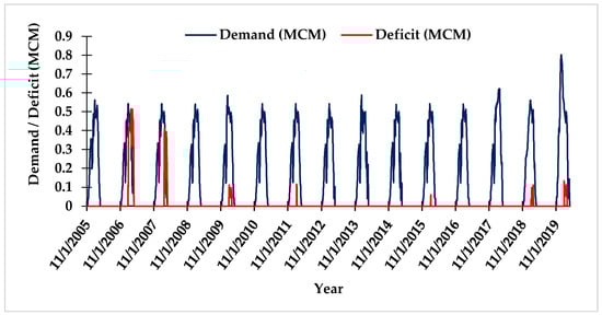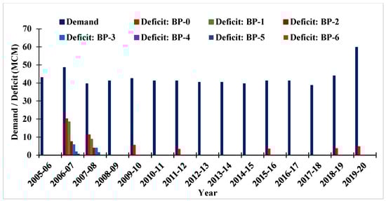 The irrigation water demand and deficit within the Parvati command area for the period from 2005 to 2020 were assessed using the MIKE HYDRO Basin model. The simulation outcomes of the model included various parameters, such as demand, supply, deficits, reservoir levels, and storage over a predefined timescale. Initially, the model was executed considering existing field conditions (BP-0), i.e., flood irrigation method, conveyance efficiency (ηc) of 45%, and no conjunctive use. The simulation results revealed significant challenges regarding water availability within the command area. Under the existing conditions, the average water demand and deficit were estimated at 42.79 MCM and 3.45 MCM, respectively. These findings highlight significant fluctuations in water demand and deficits during the study period. Notably, in 2006–2007 and 2019–2020, higher water demand was experienced, i.e., 48.50 MCM and 59.77 MCM, respectively. Conversely, 2006–2007 also saw the highest water deficit at 20.09 MCM (Figure 7), indicating substantial challenges in meeting irrigation requirements. Variations in water demand are anticipated due to various factors, such as shifts in agricultural practices, crop water needs, and effective water management strategies [48,49,50,51]. During the years 2008–2009, 2010–2011, and 2013–2014, minimal to no deficits were estimated despite varying levels of demand. This suggests the presence of efficient water conservation measures, cropping patterns, or favourable climatic conditions during those periods in the command area.