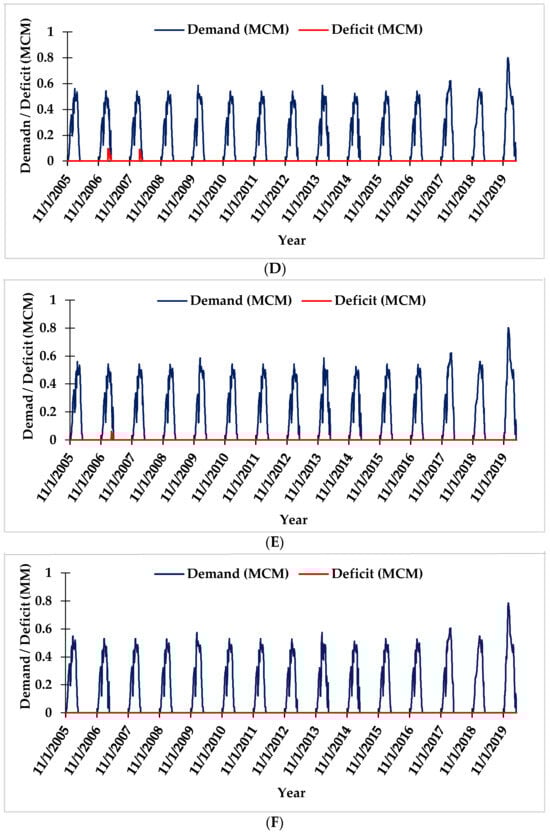 (A) Demand–deficit simulations under the BP-1 management scenario (ηc = 45%, flood irrigation, 5% GW). (B) Demand–deficit simulation under the BP-2 management scenario (ηc = 65%, flood irrigation, no GW use). (C) Demand–deficit simulation under the BP-3 management scenario (ηc = 65%, flood irrigation, 5% GW use). (D) Demand–deficit simulation under the BP-4 management scenario (ηc = 75%, flood irrigation, no GW use). (E) Demand–deficit simulation under the BP-5 management scenario (ηc = 75%, flood irrigation, 5% GW use). (F) Demand–deficit simulation under the BP-6 management scenario (ηc = 95%, sprinkler irrigation, no GW use).