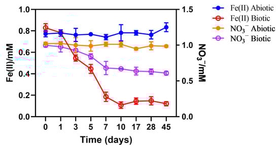 - Blöthe, M.; Roden, E.E. Composition and Activity of an Autotrophic Fe(II)-Oxidizing, Nitrate-Reducing Enrichment Culture. Appl. Environ. Microbiol. 2009, 75, 6937–6940. [Google Scholar] [CrossRef] [PubMed]