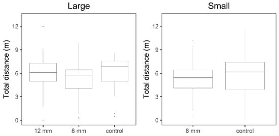 Swimming activity as total distance moved (m) in the open field test for large fish (≥50 mm; (left)) tagged with 12 mm tags, 8 mm tags, or belonging to the control group and small fish (<50 mm; (right)) tagged with 8 mm tags or belonging to the control group. The solid black horizontal line inside the bounding box is the median of total distance moved. The black dots represent the outliers, whereas the bounding box defines the Interquartile Range (IQR). The vertical solid black lines mark Q1–1.5·IQR (bottom end) and Q3 + 1.5·IQR (top end), where Q1 and Q3 are the 25th and 75th percentiles, respectively. Dots represent outliers.