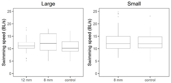 Maximum swimming speed (expressed in body length per second, BL/s) in the provoked escape response test for large fish (≥50 mm; (left)) tagged with 12 mm tags, 8 mm tags, or belonging to the control group and small fish (<50 mm; (right)) tagged with 8 mm tags or belonging to the control group. The solid black horizontal line inside the bounding box is the median of swimming speed. The black dots represent the outliers, whereas the bounding box defines the Interquartile Range (IQR). The vertical solid black lines mark Q1–1.5·IQR (bottom end) and Q3 + 1.5·IQR (top end), where Q1 and Q3 are the 25th and 75th percentiles, respectively. Dots represent outliers.
