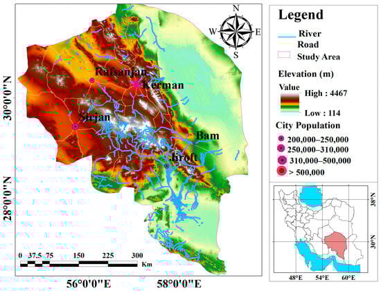 Kerman Province, with an area of 182,726 square kilometers, constitutes over 11.15% of Iran’s total area. It is located between latitudes 26.00° N and 31.00° N and longitudes 54.00° E and 59.00° E (Figure 1). Geomorphologically, the province is situated at the convergence of the high Zagros and Central Mountain ranges with the low desert regions in the southeast of Iran’s Great Central Desert. This unique confluence of diverse landscapes results in environmental characteristics that are rare elsewhere on the Iranian plateau. Kerman Province is geographically divided into two main regions: desert and temperate foothills, and its climate is classified as semi-arid desert [48].