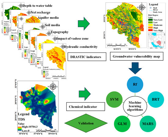 ML techniques have become a powerful asset in enhancing DRASTIC-based GwPR prediction models, as they can effectively capture non-linear interactions between influencing determinants and susceptibility standards [30,31,32]. When integrated with optimization ML algorithms, GwPR mapping significantly improves the precision of vulnerability assessments, thereby advancing groundwater management strategies [33,34]. Models such as RF, BRT, GLM, SVM, and MARS can effectively model complex information and generate valuable insights for decision-making [33,35], offering significant improvements in vulnerability analysis, especially when combined with the DRASTIC index. Ultimately, integrating the DRASTIC index with ML models offers the capability to effectively analyze complex, multidimensional, and large-scale groundwater pollution datasets [31]. This integration requires a more comprehensive analysis of the intrinsic characteristics of the hydrological system [29,32,36]. In this regard, remote sensing provides detailed information on land attributes (geology, rainfall, land use), enhancing management decisions for resource preservation and utilization [37,38,39]. In recent years, Geographic Information Systems (GIS) also facilitates the visualization and spatial analysis of groundwater data, enabling informed decision-making for sustainable water management [23,24,25,26,27,28,29,30,31,32,33,34,35,36,37,38,39,40,41,42]. These advanced technologies not only empower sustainable resource utilization but also enable more accurate prediction for effective protection and management [7,22].