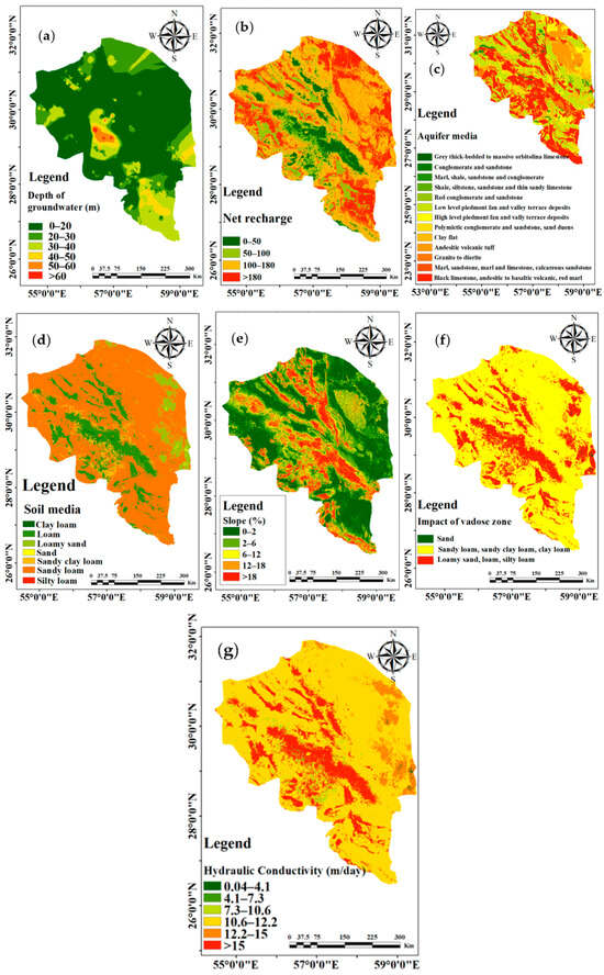 The spatial arrangement of parameters indicating groundwater vulnerability and the creation of maps illustrating the factors influencing groundwater vulnerability: (a) depth to water table, (b) net recharge, (c) aquifer media, (d) slope, (e) soil media, (f) impact of vadose zone, and (g) hydraulic conductivity.