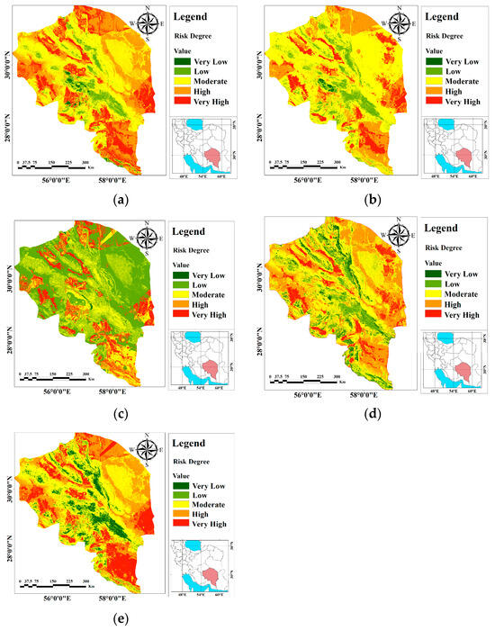 GwPR maps of the Kerman Province, highlighted by the red polygon in southern Iran, using (a) RF, (b) MARS, (c) SVM, (d) GLM, and (e) BRT.