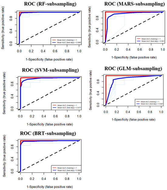 The validation outcomes of the suggested frameworks by the ROC curves for RF, MARS, SVM, GLM, and BRT.