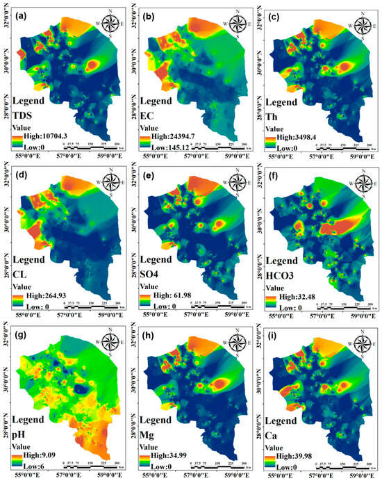 The spatial variability of (a) TDS, (b) EC, (c) Th, (d) CL−, (e) SO42−, (f) HCO3−, (g) pH, (h) Mg2+, and (i) Ca2+ concentrations in the water samples collected from the research site.