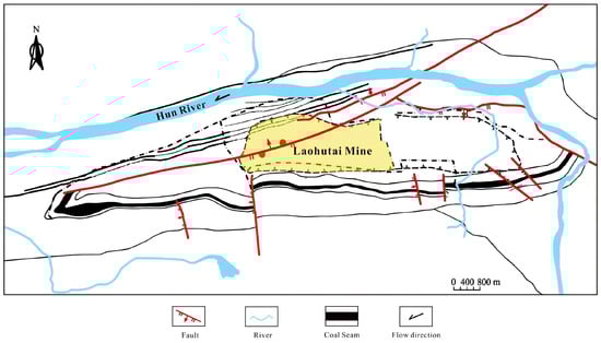 The study area is situated in the intermountain alluvial valley north of the LaoXi Mountain—Laohutai—Wanxin Mountain hills and south of the Hun River within Fushun City, Liaoning Province, China (Figure 1). An erosional-accumulative terrain with a geomorphic pattern of dendritic narrow valleys characterizes the area. The hilly region consists of tuff and basalt. The overall terrain is higher in the south and lower in the north, with Laohutai Mountain, the southernmost peak, rising to 230.70 m. The central part of the coal mine area features a flat terrain that forms an alluvial plain, generally at an elevation of 80 to 100 m. To the north, the Hun River lies. Located in the middle temperate zone, the area experiences an average annual precipitation of 804.2 mm. The hydrogeological characteristics of this area include multiple layers of rock with varying permeability, which significantly impact hydrodynamics and mine safety. Recent studies have shown that groundwater flow characteristics directly influence mine safety, especially during extreme rainfall or significant fluctuations in groundwater levels []. The lithology of the aquifer and the recharge and discharge processes of groundwater play a critical role in mine safety management. These studies provide valuable references for mining areas with complex geological conditions, such as Fushun’s Laohutai, helping to predict and prevent mine water hazards and ensure safe mine management under complex geological structures and multilayer permeable rocks [].