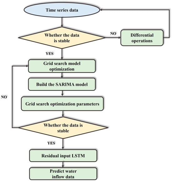 where is the residual value output from the SARIMA model, which is incorporated into the hybrid LSTM mode; indicates the value predicted by the SARIMA model. An advantage of this approach is the facilitated information exchange between the SARIMA and LSTM models. Below is the specific simulation flowchart (Figure 2):