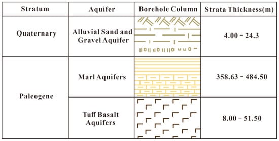 This study’s data collection site is the Laohutai mining area in Fushun, Liaoning Province, China. This area has complex hydrogeological conditions, with three significant aquifers: the alluvial sand and gravel aquifer, the marl aquifer, and the tuff-basalt aquifer. To ensure the comprehensiveness and representativeness of the data, continuous monitoring of mine water inflow in this area was conducted from January 2012 to June 2023, with monthly hydrological data collected. High-precision sensors were used for real-time monitoring during the data collection process, and the equipment was regularly calibrated to eliminate measurement errors caused by sensor drift. Standardized statistical methods, such as outlier removal and imputation techniques, were applied to handle outliers and missing values, ensuring the accuracy and consistency of the data. Additionally, multiple measurements and independent verifications were conducted to ensure the reliability of the data. Figure 3 below presents a hydrogeological generalization of the study area.
