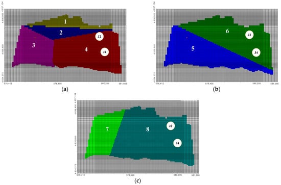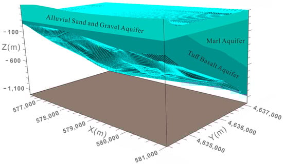 The elevation data for each layer point were derived from borehole test results, with elevation distribution for each aquifer roof elevation extended using the Kriging interpolation method. Flow model simulations under transient conditions were conducted over two months, from January to February 2023. The simulation area was delineated based on the minefield management area and partitioned into several grids, each grid cell measuring 80 × 80 m. Grids outside the mine were designated inactive, while only those within were subdivided. Hun River in the northern mining area, lacking direct hydraulic connection to the underground aquifer, was designated a fixed head boundary. The western boundary, covering Old West Mountain and Shengli Mining Area, was classified as water-isolated due to no direct hydraulic connection with the study area. Similarly, the southern boundary by Laohutai, the eastern boundary by Longfeng Jingtian, and the mining area, all lacking direct hydraulic connections, were designated as water-isolated boundaries. The first aquifer in study area, a submerged boundary, receives minimal atmospheric precipitation recharge and participates in cycle of evapotranspiration rate and excretion. Its surface maintains the direct hydraulic connection, while the model bottom comprises relatively watertight bedrock, designated as a watertight boundary. The three-dimensional geological model is established as follows Figure 4: