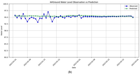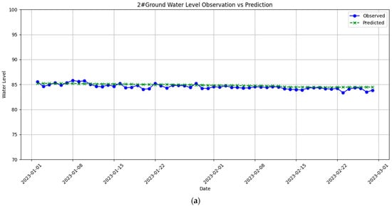 In this study, Visual MODFLOW was first selected for the numerical simulation of mine water inflow. Visual MODFLOW is one of the most widely used tools for groundwater flow simulation, suitable for heterogeneous anisotropic three-dimensional transient flow systems. When building the model, we conducted a detailed hydrogeological parameter zoning (such as permeability coefficients) of the study area to ensure the model’s accuracy and realism. Compared to other simulation tools, such as GMS and FLAC 3D, Visual MODFLOW has a higher computational efficiency and is easier to integrate with AutoCAD to obtain accurate three-dimensional coordinate data []. However, traditional numerical simulation methods often rely on complex hydrogeological data and require precise boundary condition settings, which introduces limitations in practical applications []. Therefore, we applied a GS-SARIMA-LSTM-based time series forecasting method to address the prediction challenges in cases where hydrogeological parameters are incomplete. To clearly demonstrate the effects of various prediction methods, a comparison chart of prediction trends is provided, as illustrated in Figure 15, thus demonstrating G-S-L’s slightly superior overall predictive effectiveness compared to VM. In monthly RMSE calculations, G-S-L consistently exhibits smaller errors than VM at all data points in Table 3. Particularly in April, May, and June, G-S-L RMSE values are significantly lower than those of VM, indicating G-S-L has a greater accuracy in these months, thereby confirming the method’s stability and precision in month-to-month predictions. R2 analysis indicates that an R2 value close to 1 signifies effective prediction and explanation of data variations. R2 comparisons show that G-S-L achieves positive R2 values in February, March, and June, with particularly high values in February and March, notably, 0.925511 in February, demonstrating exceptional model performance. Conversely, VM exhibits negative R2 values in most months, performing better only in February and March, yet still failing to surpass G-S-L performance.