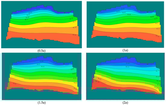 Coal production is mainly located in the northern part of the mine area. Based on the distribution of the area and the mining plan, changes in water levels are predicted within two years of mining. As the mine area expands, dredging will be required to mitigate the risk of water surges. Due to inadequate groundwater recharge, mining and dredging will disrupt natural groundwater recharge, causing an imbalance in discharge and a subsequent decline in water levels in the northern area of the mine. As shown in Figure 7, the water level gradually declined over two years. Maintaining a continuous production plan may lead to a reduction in available groundwater resources, requiring protective measures.