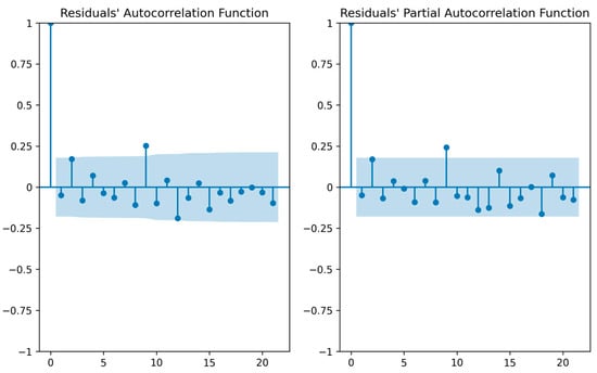 Hyperparameters p and q were determined using PACF and ACF plots, as illustrated in Figure 10. Blue bars represent significance confidence bands, within which the function value is considered zero. At lag 10, the ACF plot shows a significant non-zero value but does not truncate significantly within the lag period, suggesting a slight autocorrelation in the process. The PACF plot, displaying significant non-zero values at lag 10 and some lower order lags, does not truncate significantly within the lag period, indicating the absence of a significant AR process.