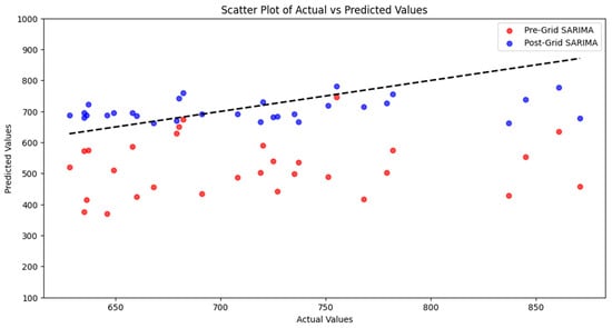 The optimal SARIMA model is identified by systematically evaluating various parameter combinations through grid search optimization, based on information criteria such as AIC and BIC. All SARIMA parameter permutations are listed to form a grid, with SARIMA modeling subsequently conducted based on these combinations. A scoring mechanism, such as cross-validation approach, is required to evaluate each model, with the highest scoring parameter combination ultimately selected as follows: Selected model parameters, SARIMA (0,1,1) (1,1,1) [], are exhibited to perform best according to AIC and BIC values, indicating a good fit with data. The accompanying Figure 11 compares prediction results using a scatter plot.