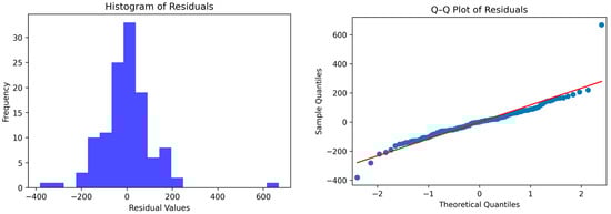 The SARIMA model results are primarily evaluated using residual tests. If residuals (residuals = actual observations − model predictions) are normally distributed, it can be inferred that they are stochastic, suggesting a better fit to the random error, as depicted in the figure. The normal distribution of residuals can be confirmed through the Q–Q plot, as illustrated in Figure 13. The Q–Q plot of residuals tests whether the residuals follow a normal distribution. The red line represents the theoretical quantiles under the standard distribution assumption. The residuals are approximately normally distributed if the residual points are distributed near this red line. The plot shows that most of the data points align closely with the red line, suggesting that the residuals largely conform to normality.