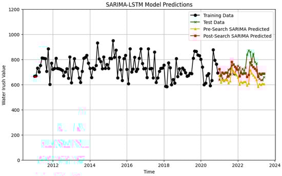 Time series prediction scenario methods have been increasingly applied to predict influxes [,]. SARIMA’s main approach involves adapting the model to seasonal variations through seasonal differencing, enhancing its ability to predict seasonal fluctuations in the data. However, SARIMA, which performs linear modeling, struggles with complex nonlinear problems [,,]. LSTM, a widely utilized recurrent neural network, efficiently processes and memorizes long-term dependent information through its gating mechanism. It is noted for its simplicity and ease of training [,,,]. GS-SARIMA-LSTM merges SARIMA’s seasonal processing capabilities with LSTM’s long-term memorization abilities, enabling the effective handling of complex time series data with seasonal and long-term trends. An advantage of grid search is its systematic exploration of different parameter combinations to identify optimal settings for the model. By leveraging both GS-SARIMA-LSTM and grid search optimization, the model achieves greater accuracy and stability in handling complex time series data. This study compares the prediction capabilities of traditional Visual MODFLOW software and the GS-SARIMA-LSTM model by analyzing inflow data from January to June 2023. The study results indicate that G-S-L predictions more closely align with the raw data. G-S-L’s integration of time series analysis and deep learning enables it to more effectively capture dynamic changes and complex nonlinear relationships in the data, enhancing its surge prediction performance. Although G-S-L performed well in this study, its complexity and the high volume of data required may restrict its broader application. Future research could optimize G-S-L’s parameter settings and test it across diverse datasets to confirm its broad applicability and reliability.