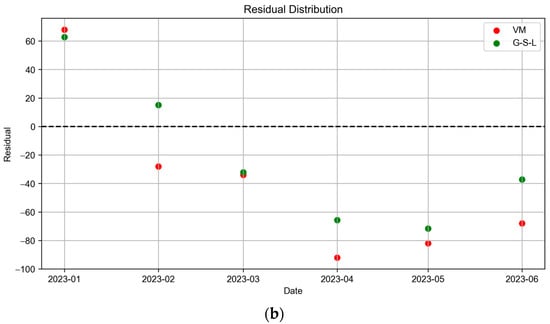Visualization and analysis of the residual plot and fitted curve graph reveal that G-S-L residuals are closer to the zero line and exhibit a more concentrated distribution, indicating smaller and more uniform prediction errors. Concurrently, G-S-L prediction curves align more closely with the raw data, demonstrating its enhanced capability in trend prediction. Specifically, in the residual plot, the G-S-L residual line (green) is closer to the zero line compared to VM (red), and features a more concentrated distribution, suggesting that G-S-L prediction errors are smaller and more uniformly distributed near the raw data. Regarding the fitted curve plots, G-S-L prediction curves better match the raw data, affirming its superior performance in capturing data trends and changes, particularly in upward and downward movements. G-S-L more accurately reflects the actual conditions, while VM exhibits some bias.